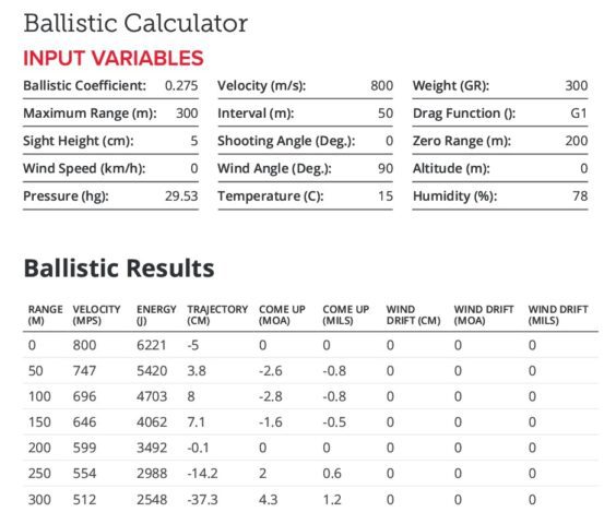 - Tiene una rasante aceptable hasta 250 mts, pues como observarás en la tabla adjunta, con una punta de 300 grs y una velocidad de salida de 800 m/s, haciéndolo impactar 8 cm por encima del cero a 100 mts, a 200 mts impactará centrado y a 250 mts impacta solo 14 cm por debajo del cero. Por encima de esta distancia, la caída se incrementa y a 300 mts ya impacta 37 cm bajo.